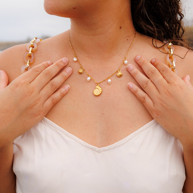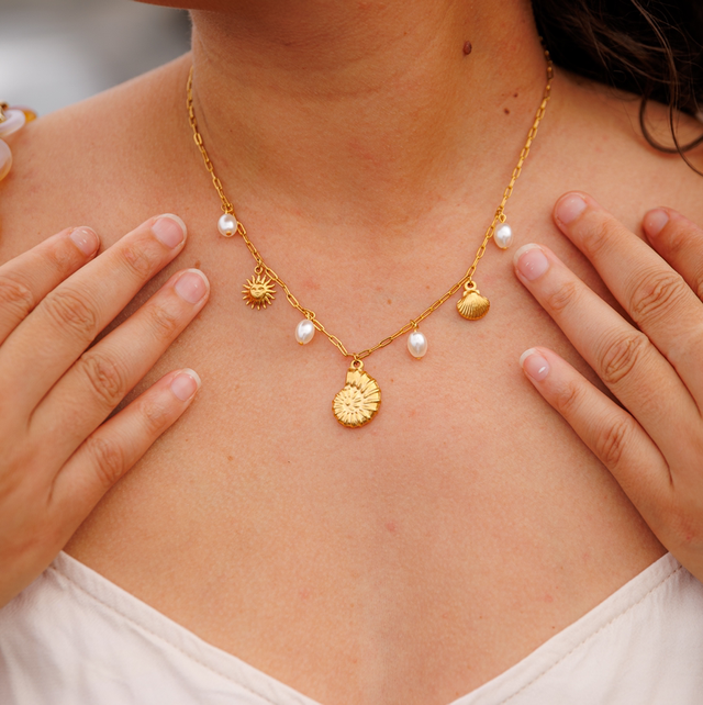 Son pendentif combine un soleil rayonnant, de petits coquillages et une perle nacrée qui capte la lumière avec élégance.